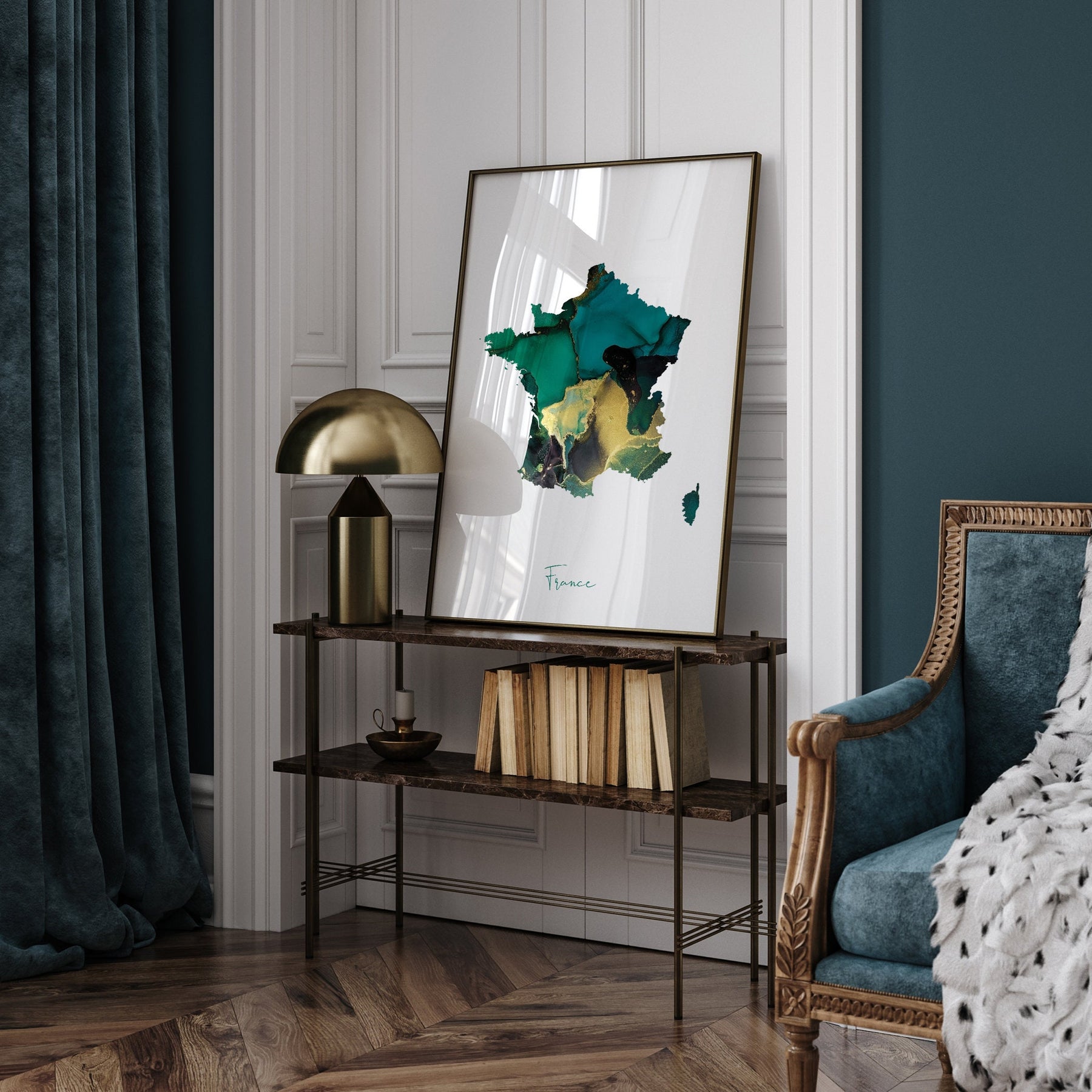 France Map Emerald Green and Gold Wall Art Print