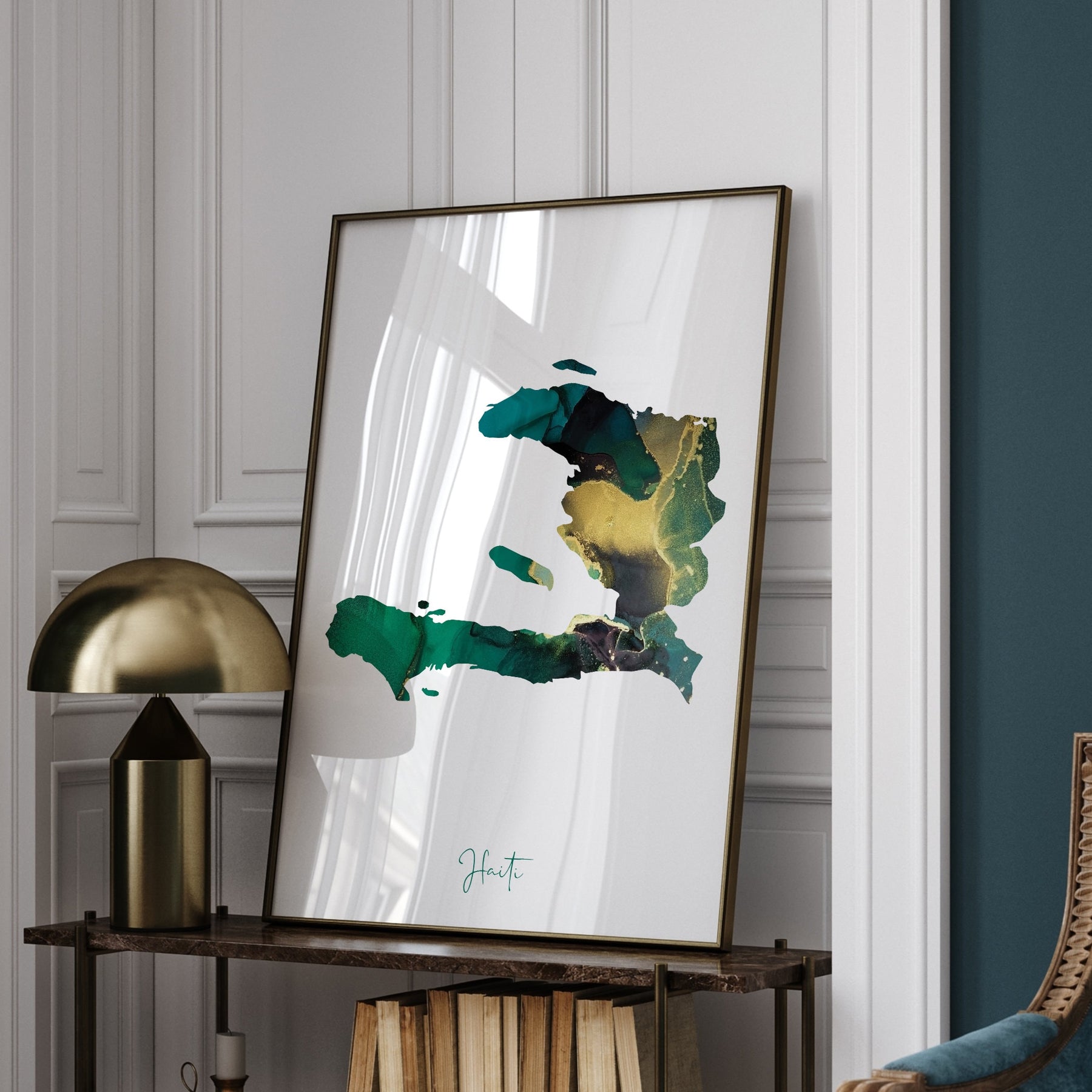 Unframed Emerald Green & Gold Haiti Map Wall Art Print (Please note the colours may vary slightly from those displayed on your screen)