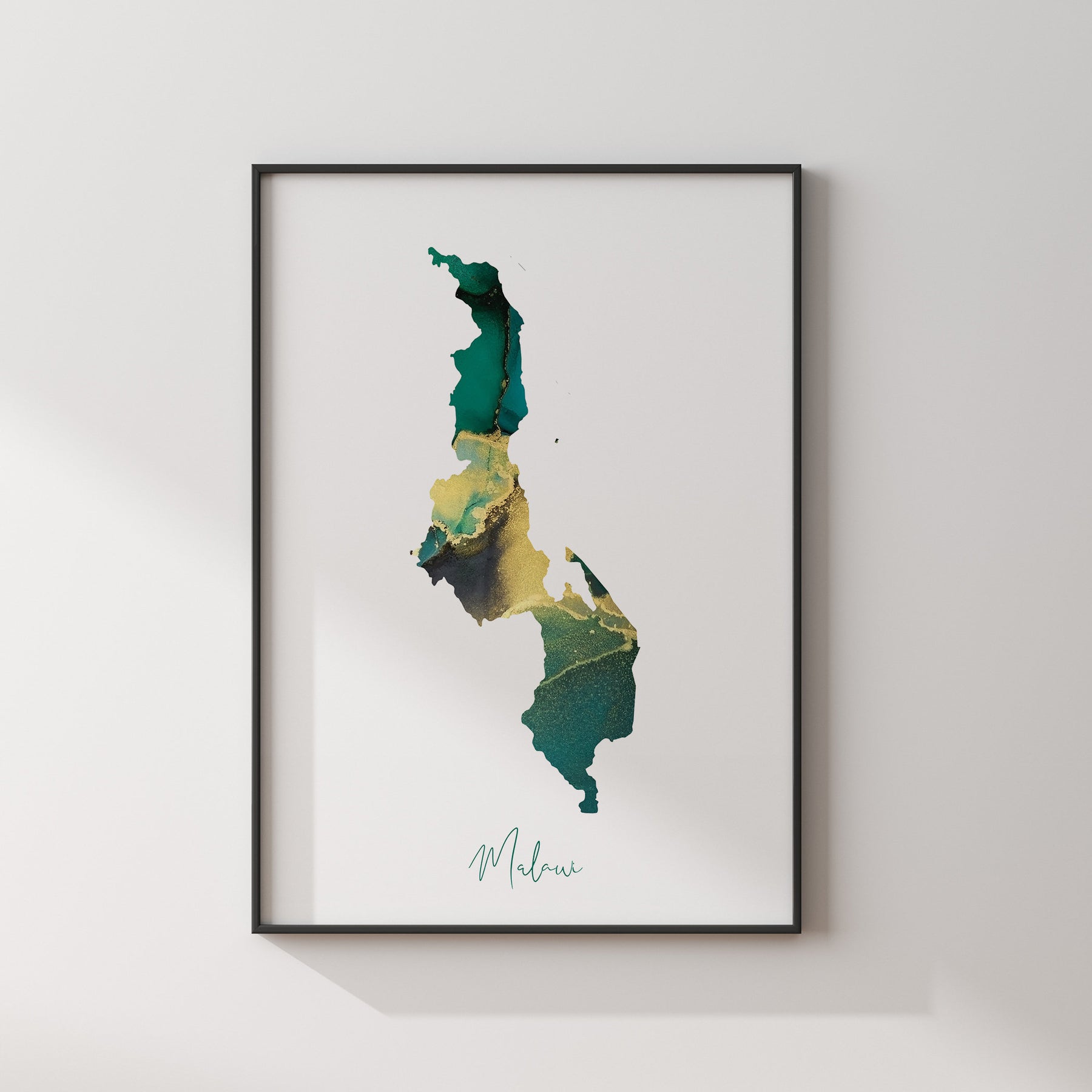 Unframed Emerald Green & Gold Malawi Map Wall Art Print (Please note the colours may vary slightly from those displayed on your screen)