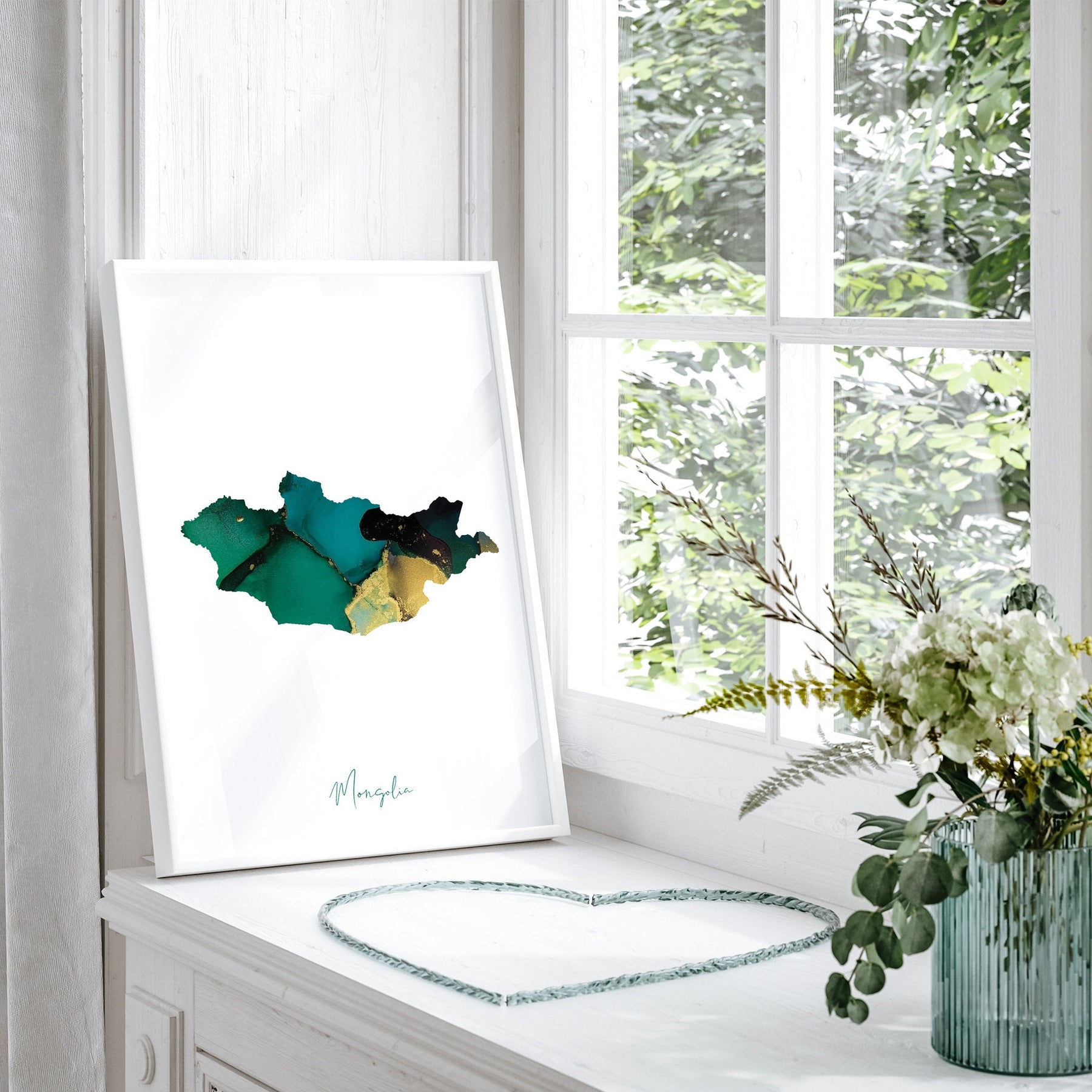 Unframed Emerald Green & Gold Mongolia Map Wall Art Print (Please note the colours may vary slightly from those displayed on your screen)
