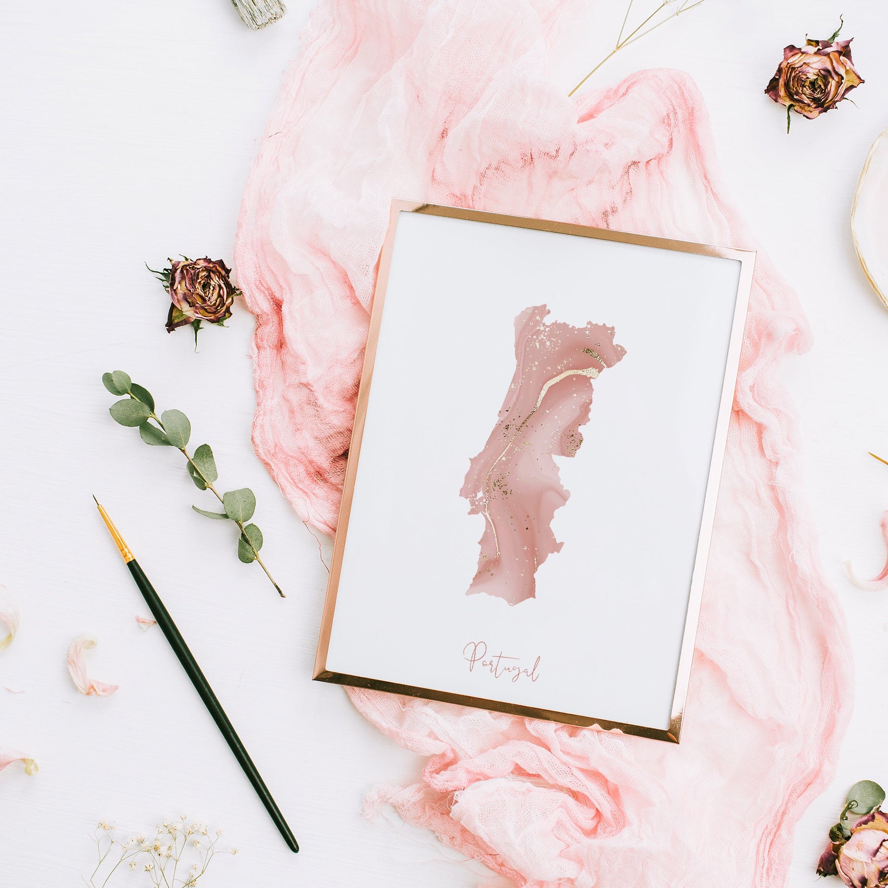 Unframed Pink & Gold Portugal Map Wall Art Print (Please note the colours may vary slightly from those displayed on your screen)