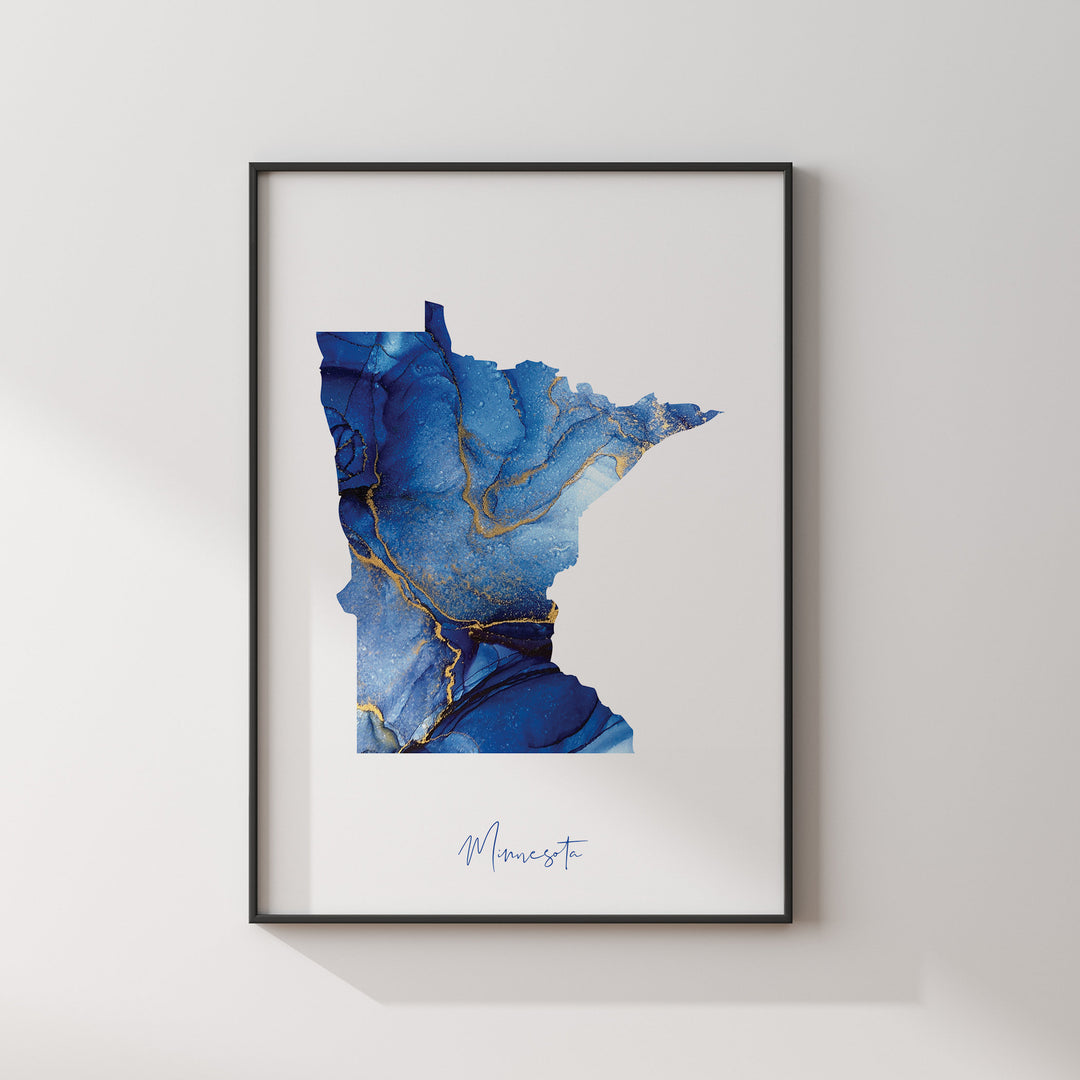 Minnesota Map Blue and Gold Wall Art Print | US State | United States of America | USA