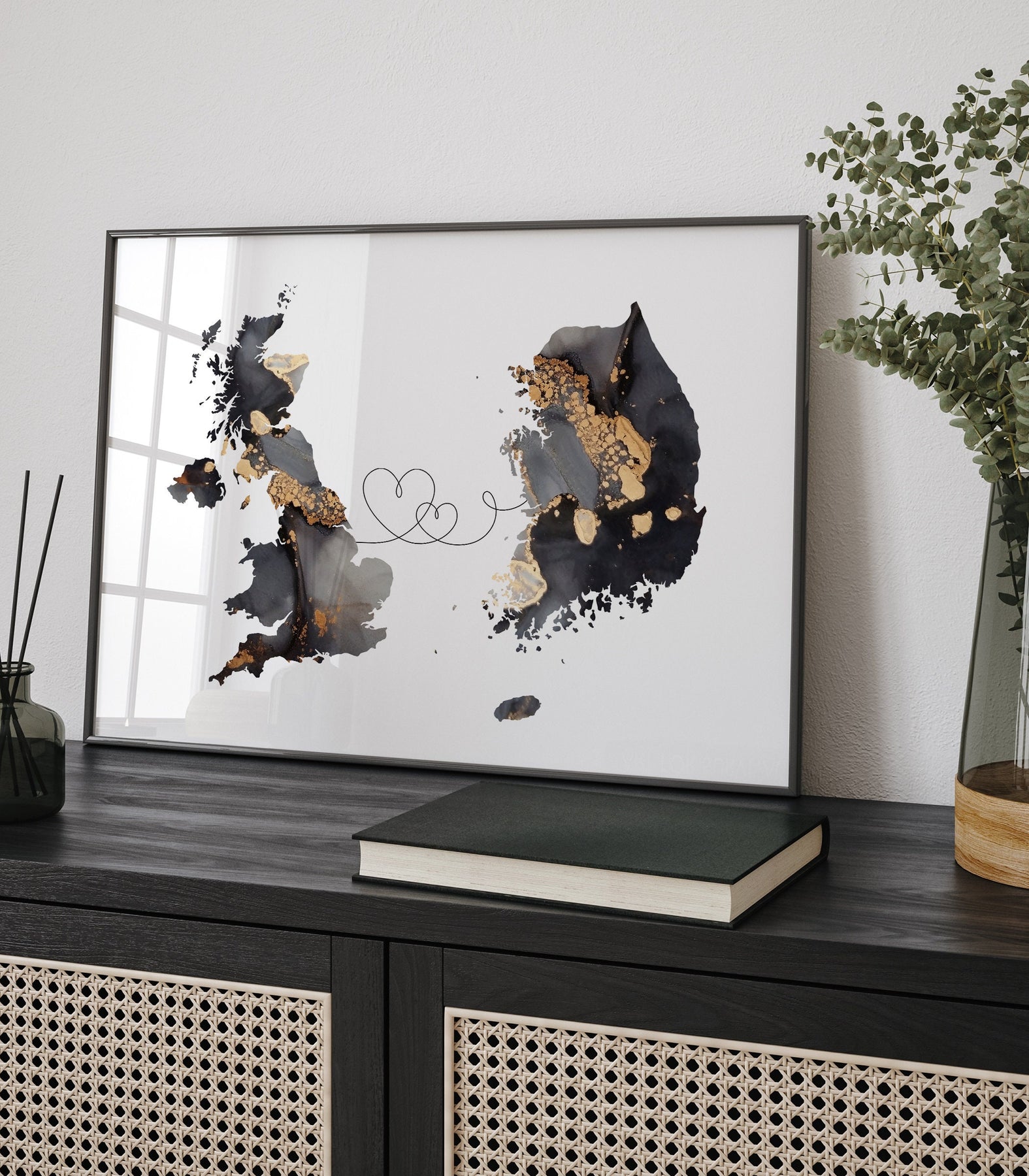 Britain and South Korea Map Black & Gold Travel Wall Art Print | United Kingdom | UK
