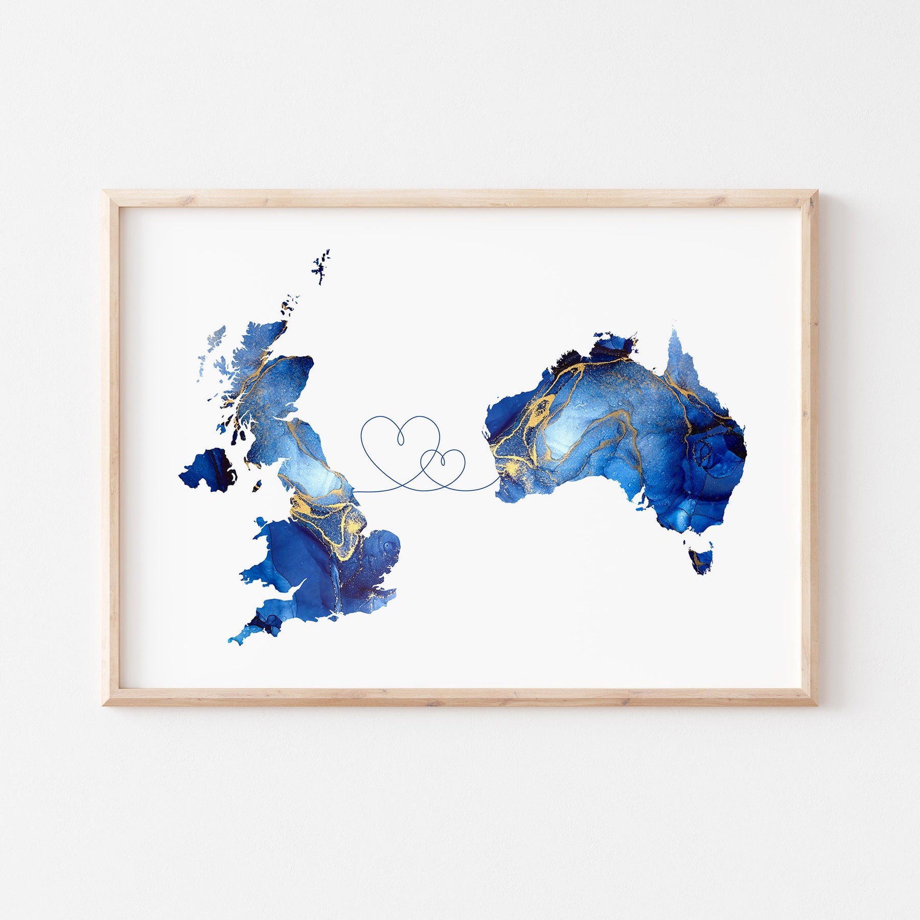 Custom Any Two Countries Map Blue & Gold Travel Wall Art Print (Not Possible to Deliver For Christmas)