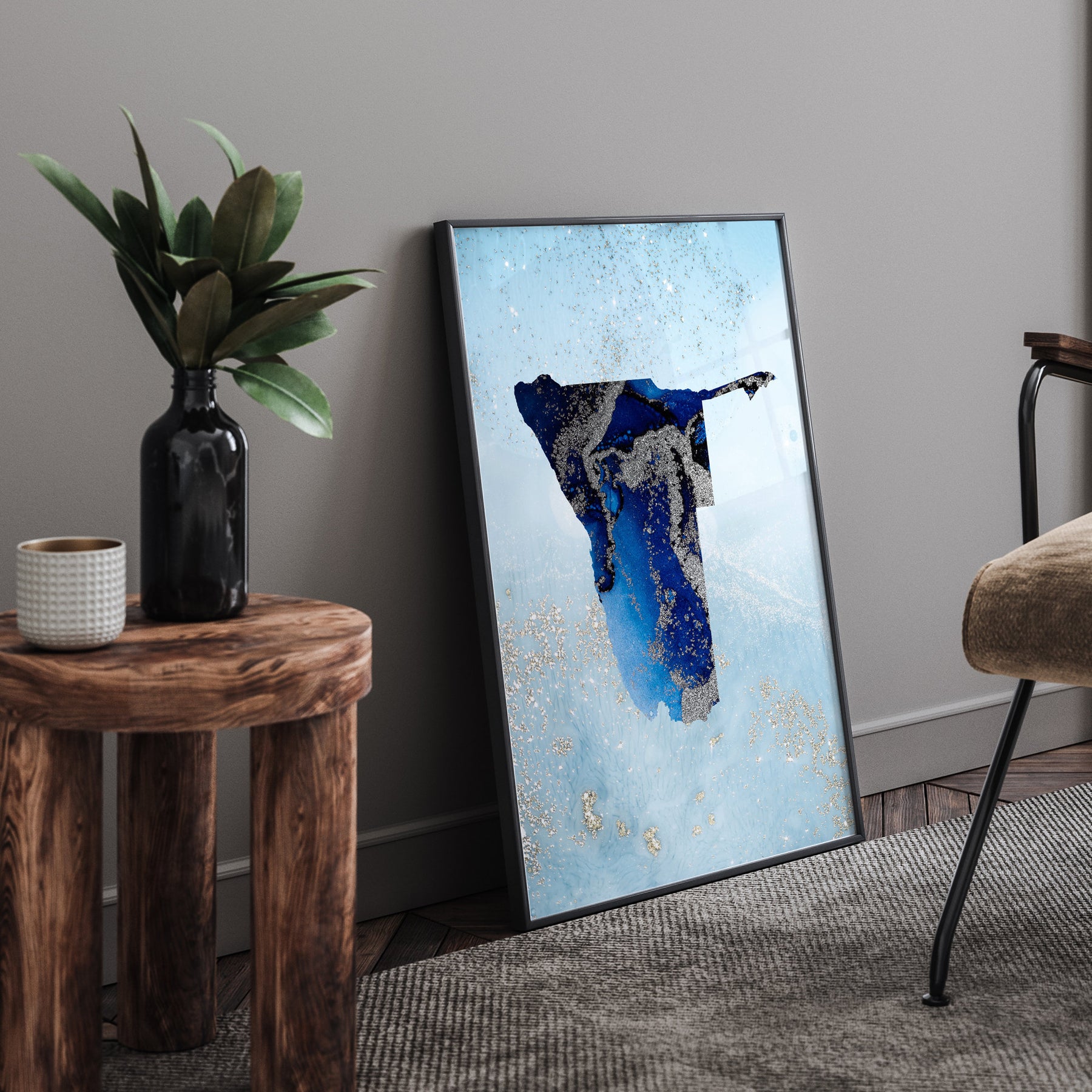 Namibia Map Shades of Blue & Silver Wall Art Print