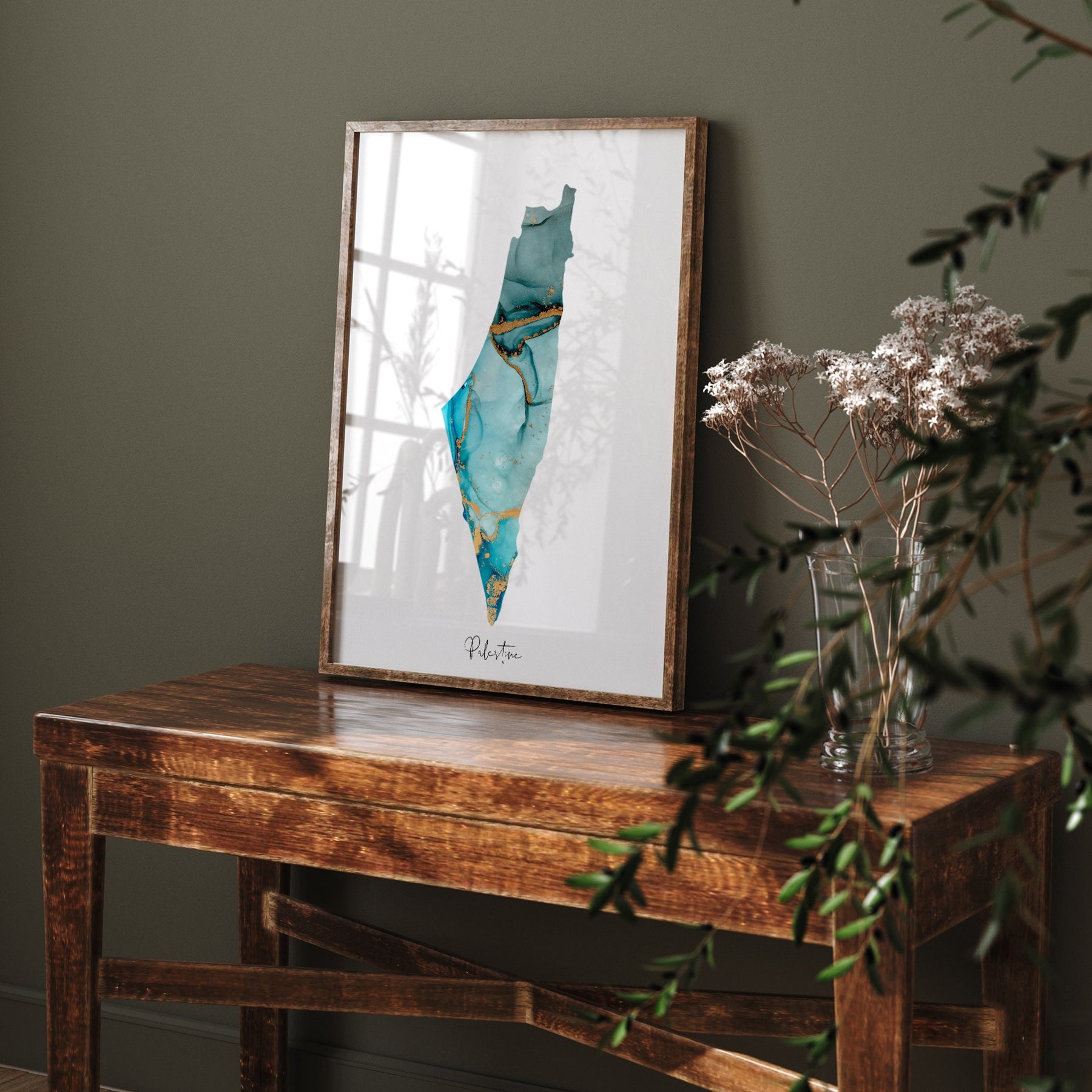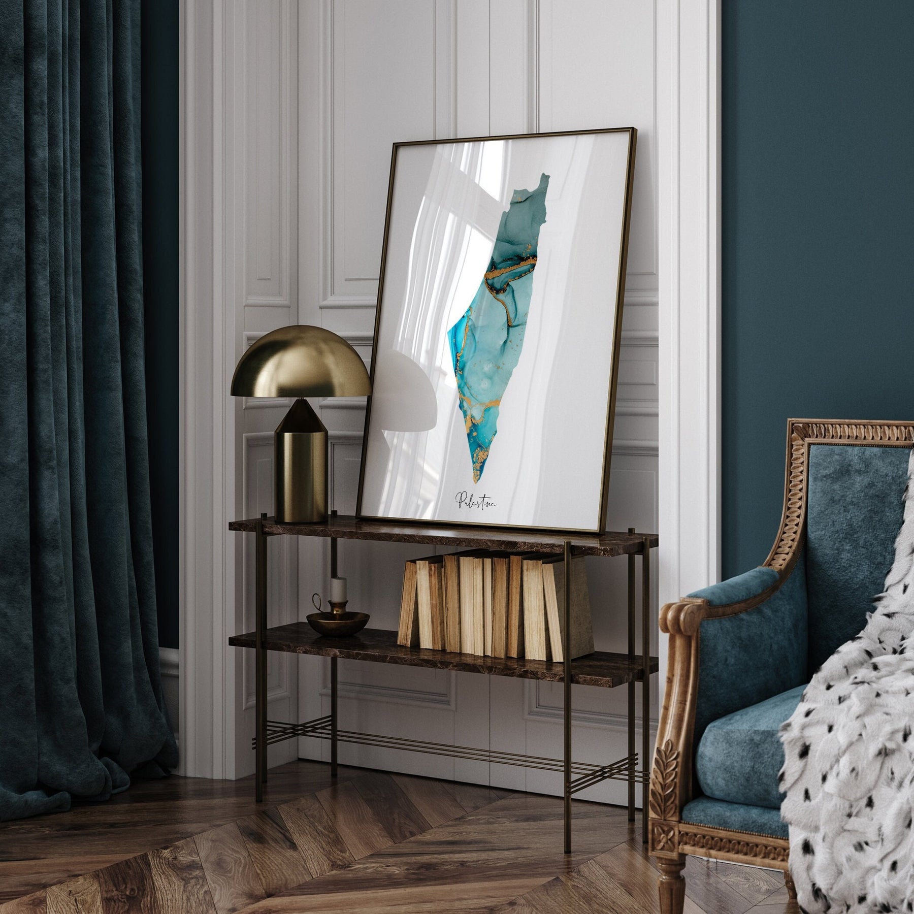Palestine Map Shades of Blue & Green With Gold Wall Art Print