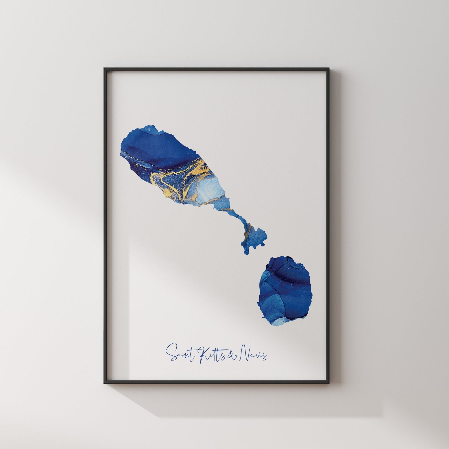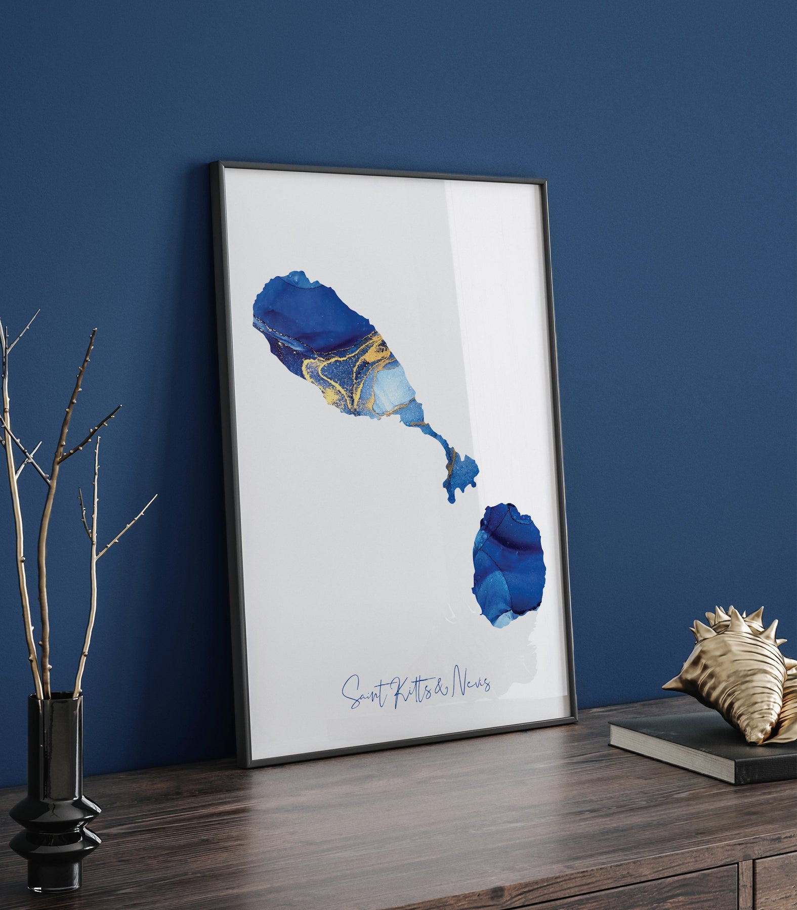 Unframed Blue & Gold Saint Kitts & Nevis Map Wall Art Print (Please note the colours may vary slightly from those displayed on your screen)