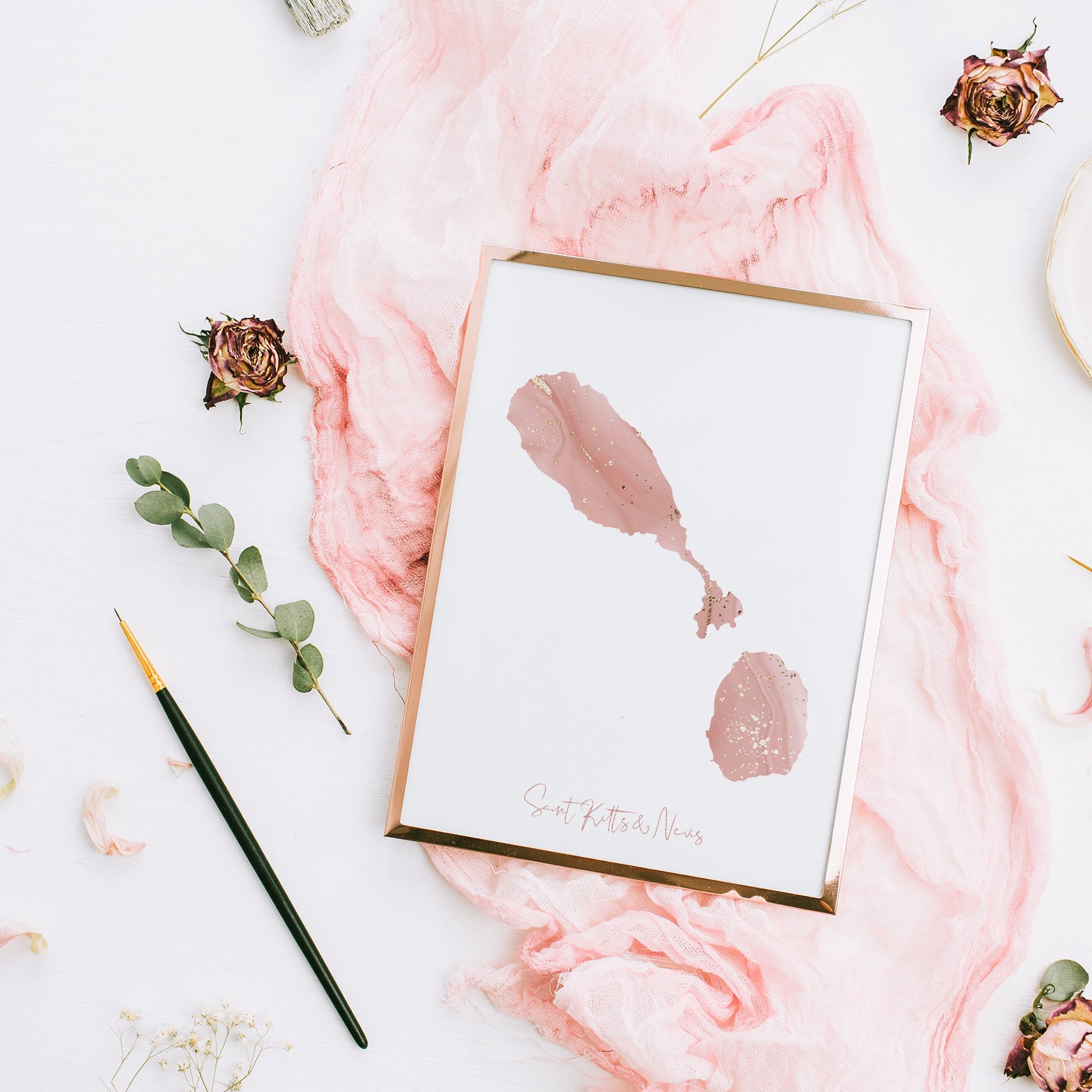Unframed Pink & Gold Saint Kitts & Nevis Map Wall Art Print (Please note the colours may vary slightly from those displayed on your screen)