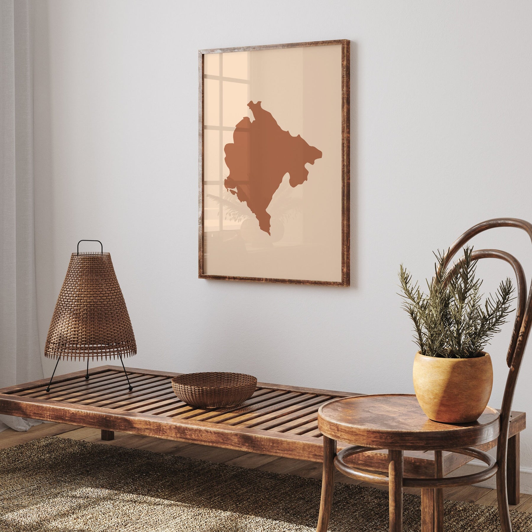 Unframed Montenegro Map wall art print in a boho mid century design.