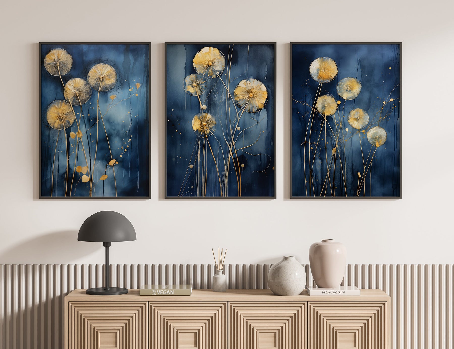 Unframed Set of 3 Navy Blue & Gold Dandelion Wall Art Prints.