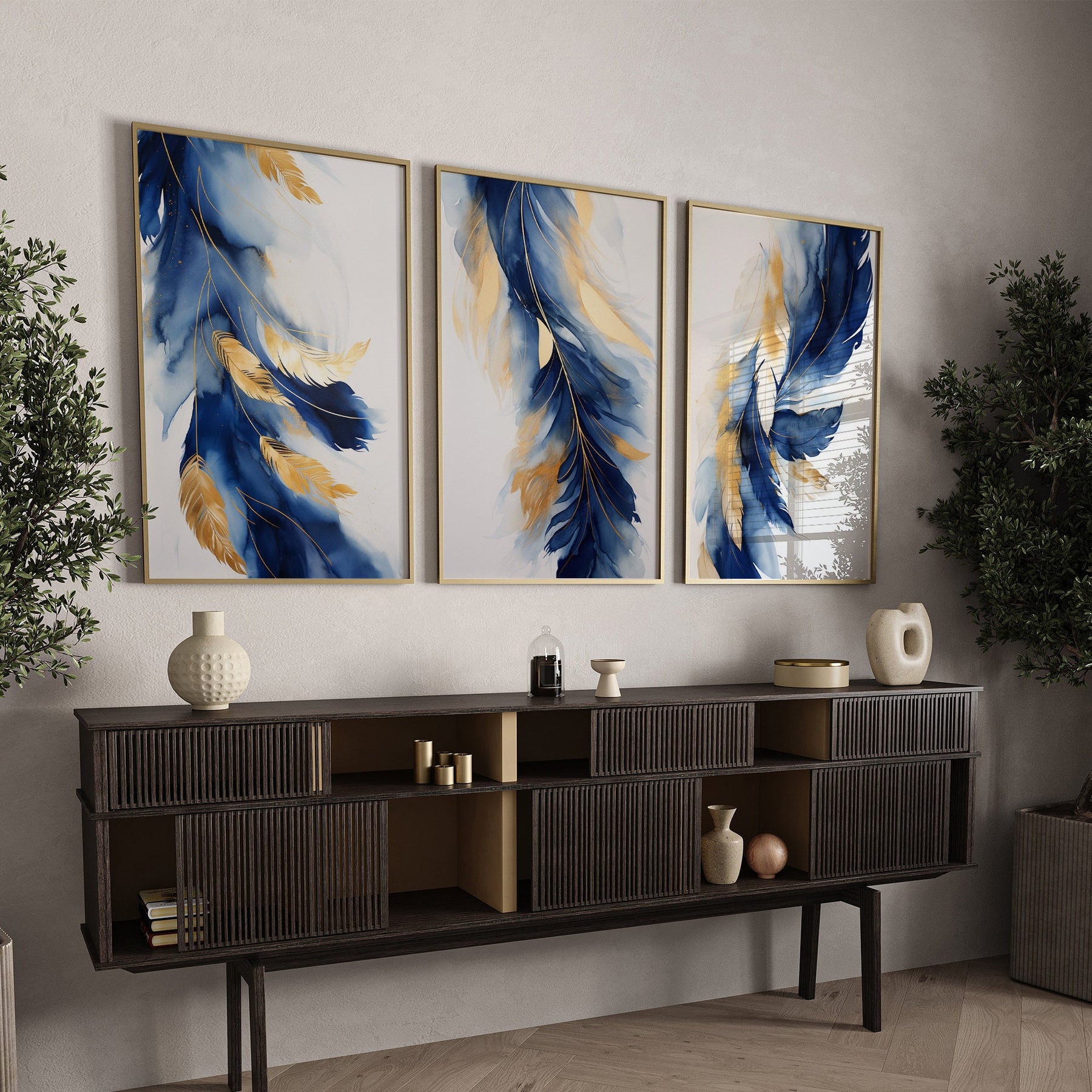 Unframed Set of 3 Navy Blue & Gold Feather Wall Art Prints.