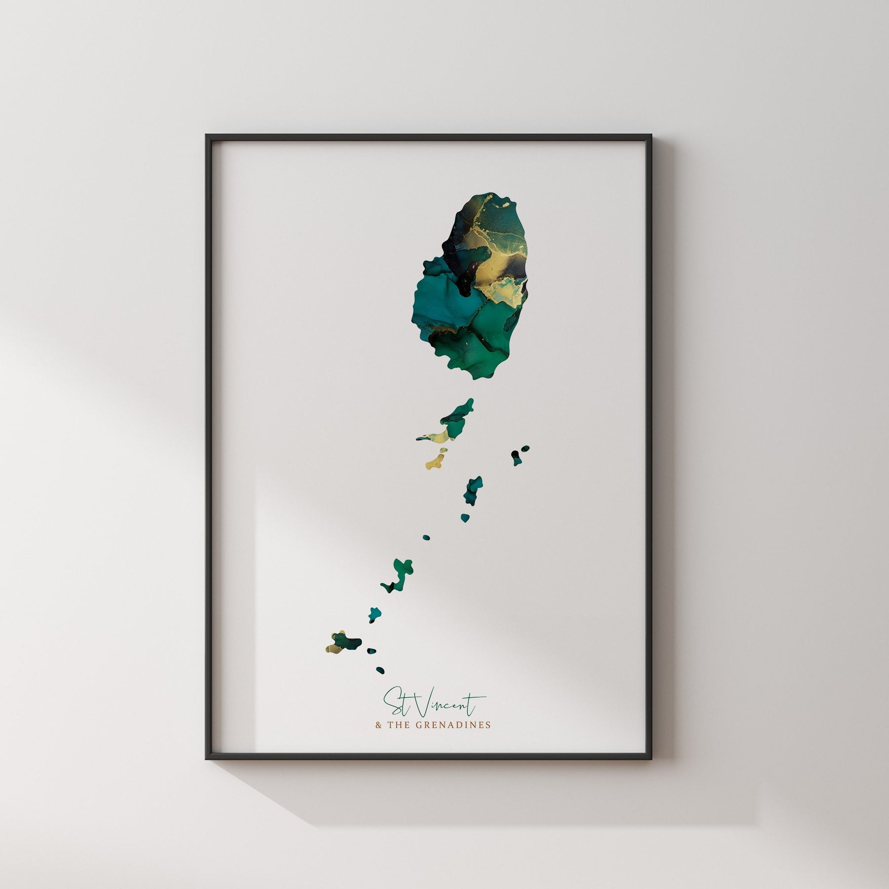 Unframed Emerald Green & Gold Saint Vincent and the Grenadines Map Wall Art Print (Please note the colours may vary slightly from those displayed on your screen)