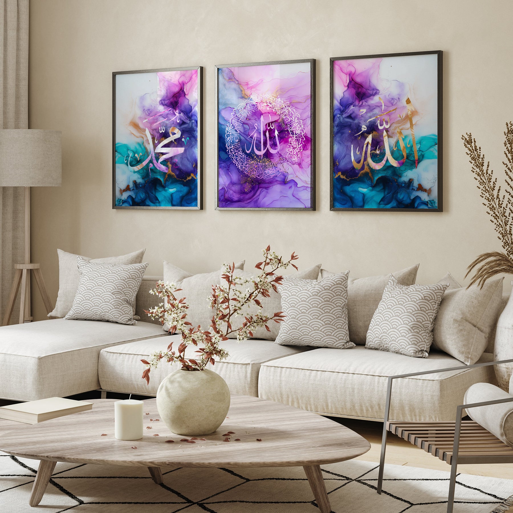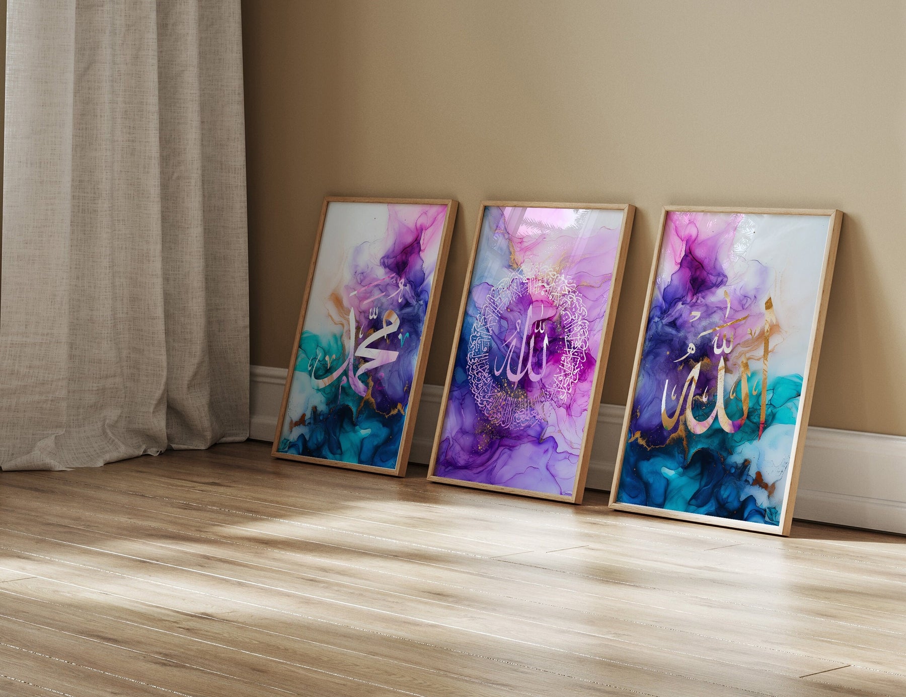 Set of 3 Islamic Wall Art Watercoluor Allah Muhammad Ayatul Kursi Arabic Calligraphy Edition